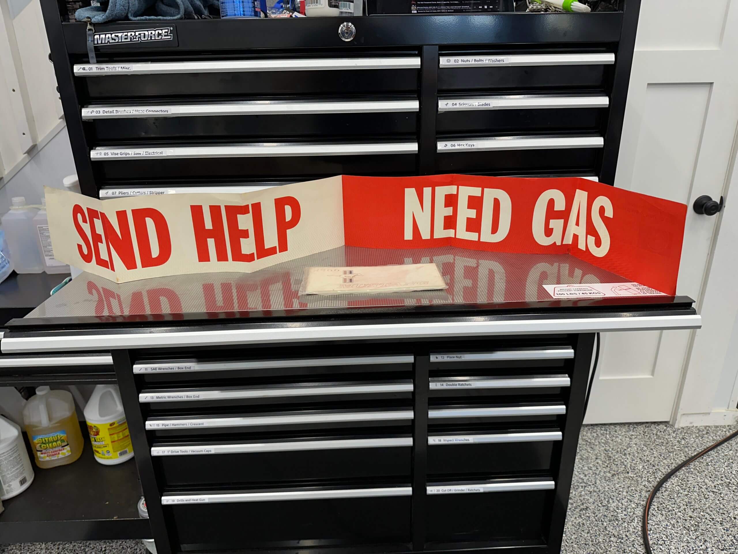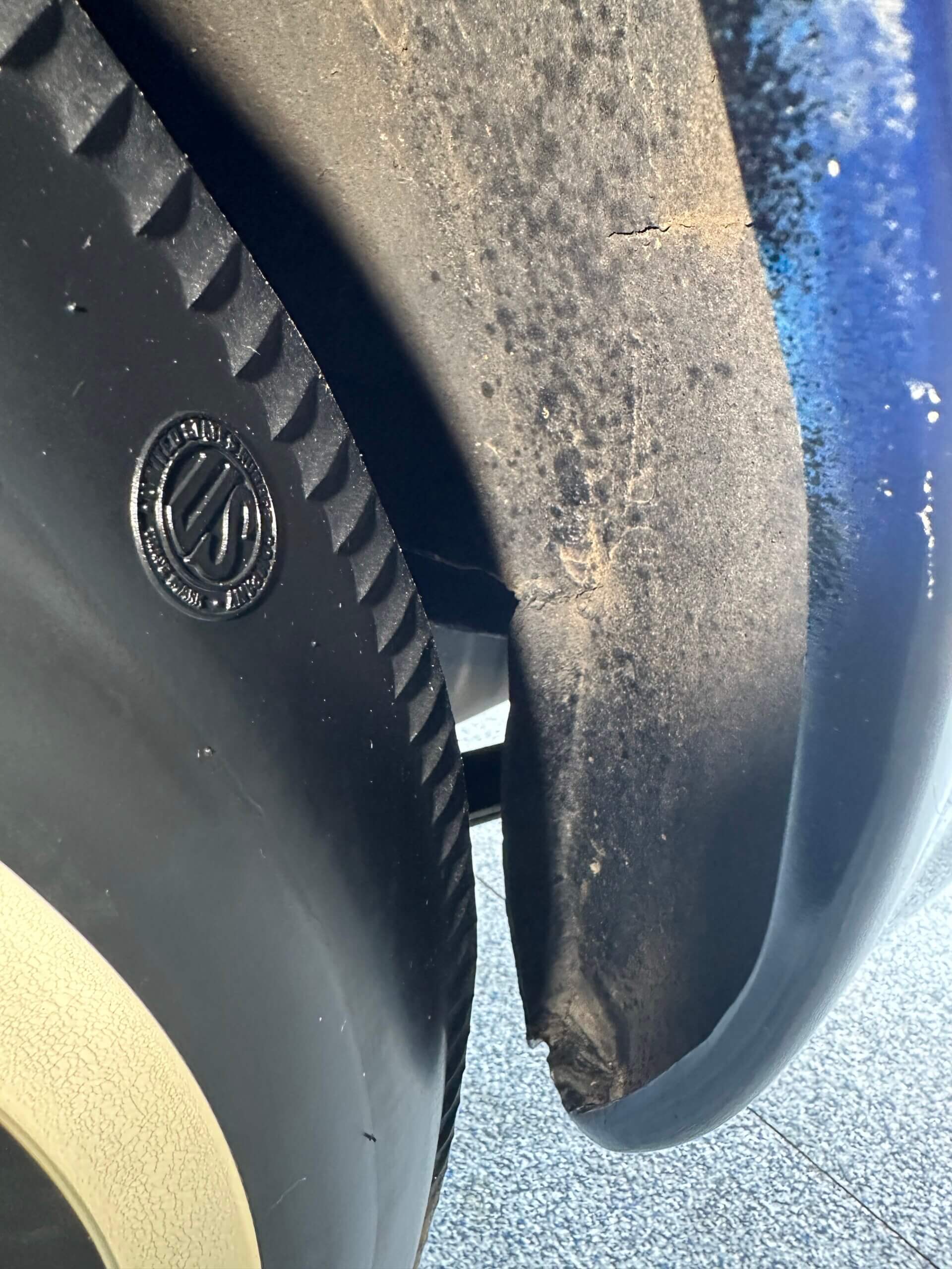 • The tires are over 10 years old; prior to driving long distances or faster speeds, new tires are recommended. The current tires for the factory wheels are 14-inch 6.95 with narrow whitewall.