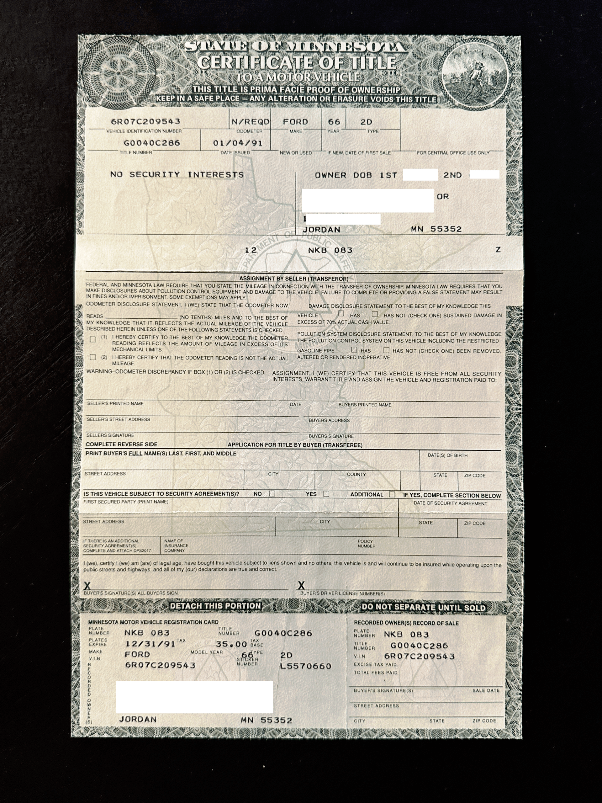 • This is a California car retailed in Texas. The second owner brought it to Minnesota (Owatonna) when it was purchased by the current owner (Jordan, MN) in 1990.