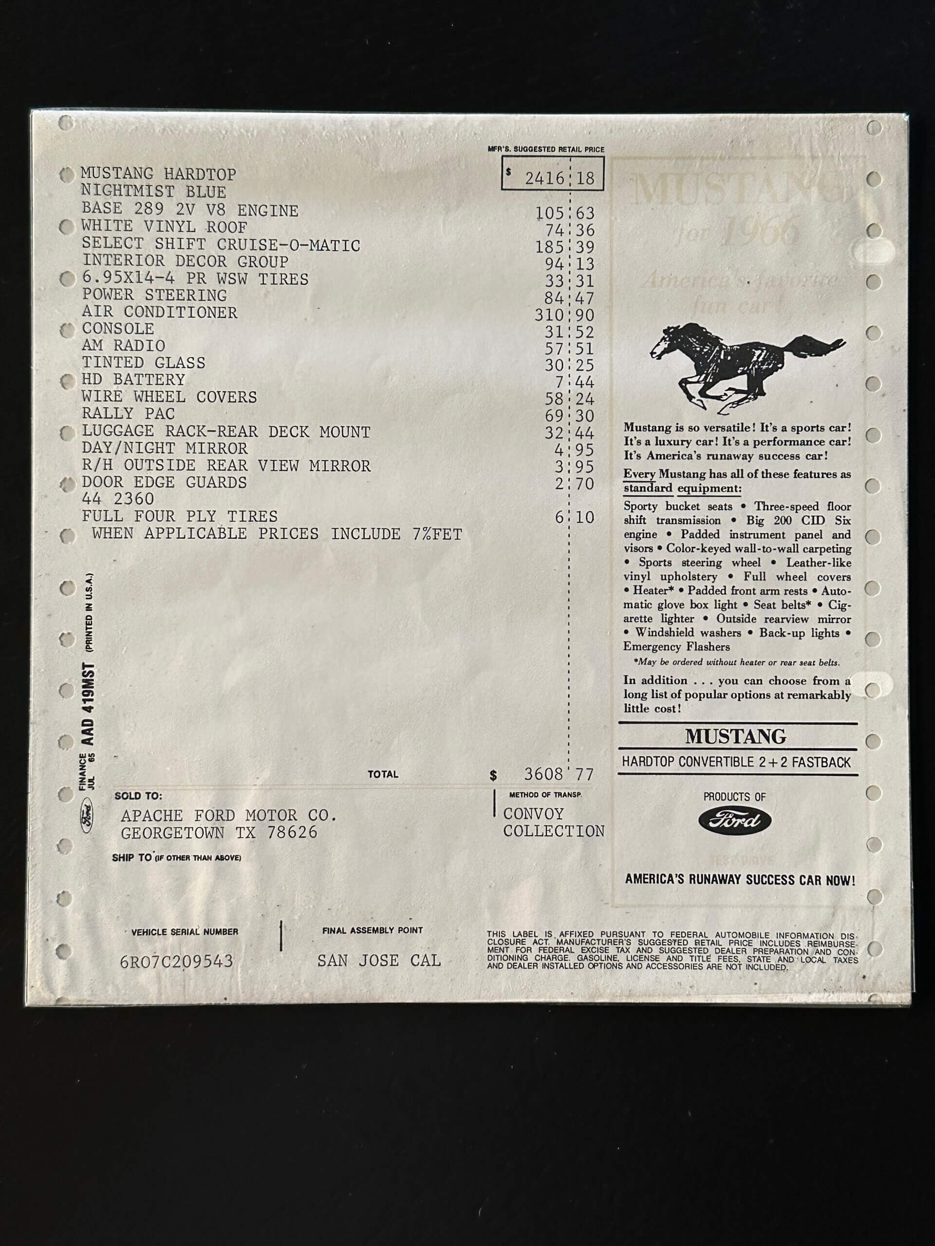 This car has had the right life: long-term ownership, top-tier restoration, careful use, and complete presentation—with the documentation to back it up. If you value originality, correctness, and pride of ownership, this Nightmist Blue ’66 checks the boxes.